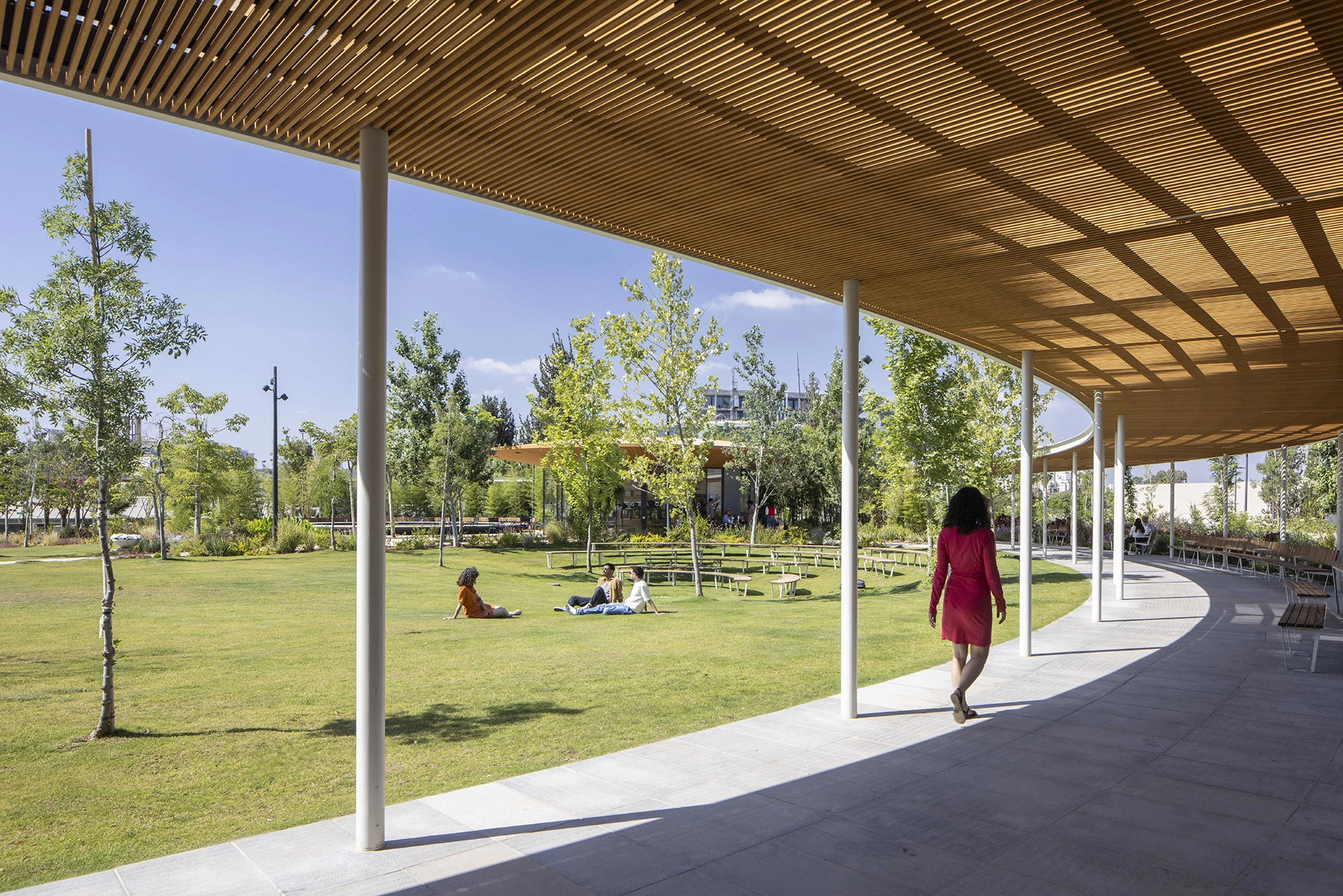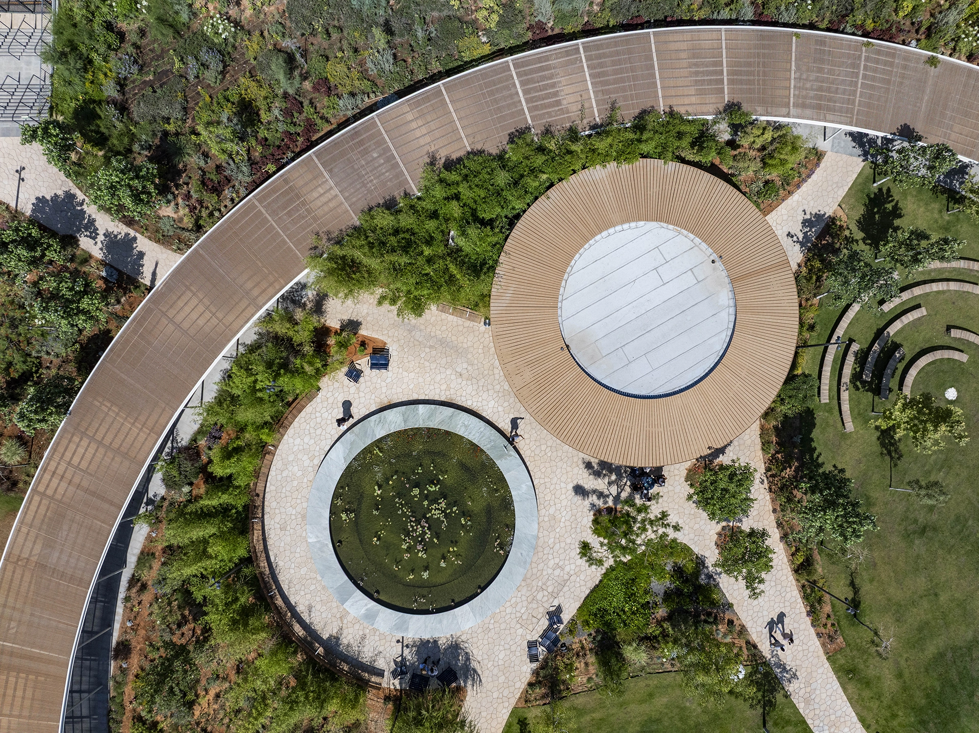 The landscape design introduces a complementary and contrasting geometry based on the circle, enabling inward convergence and a soft connection between the various buildings. At the center of the garden stands a wooden pergola with a diameter of approximately 80meters, beneath which diverse seating areas were created, allowing for a range of social interactions—from solitary seating to shared meals.