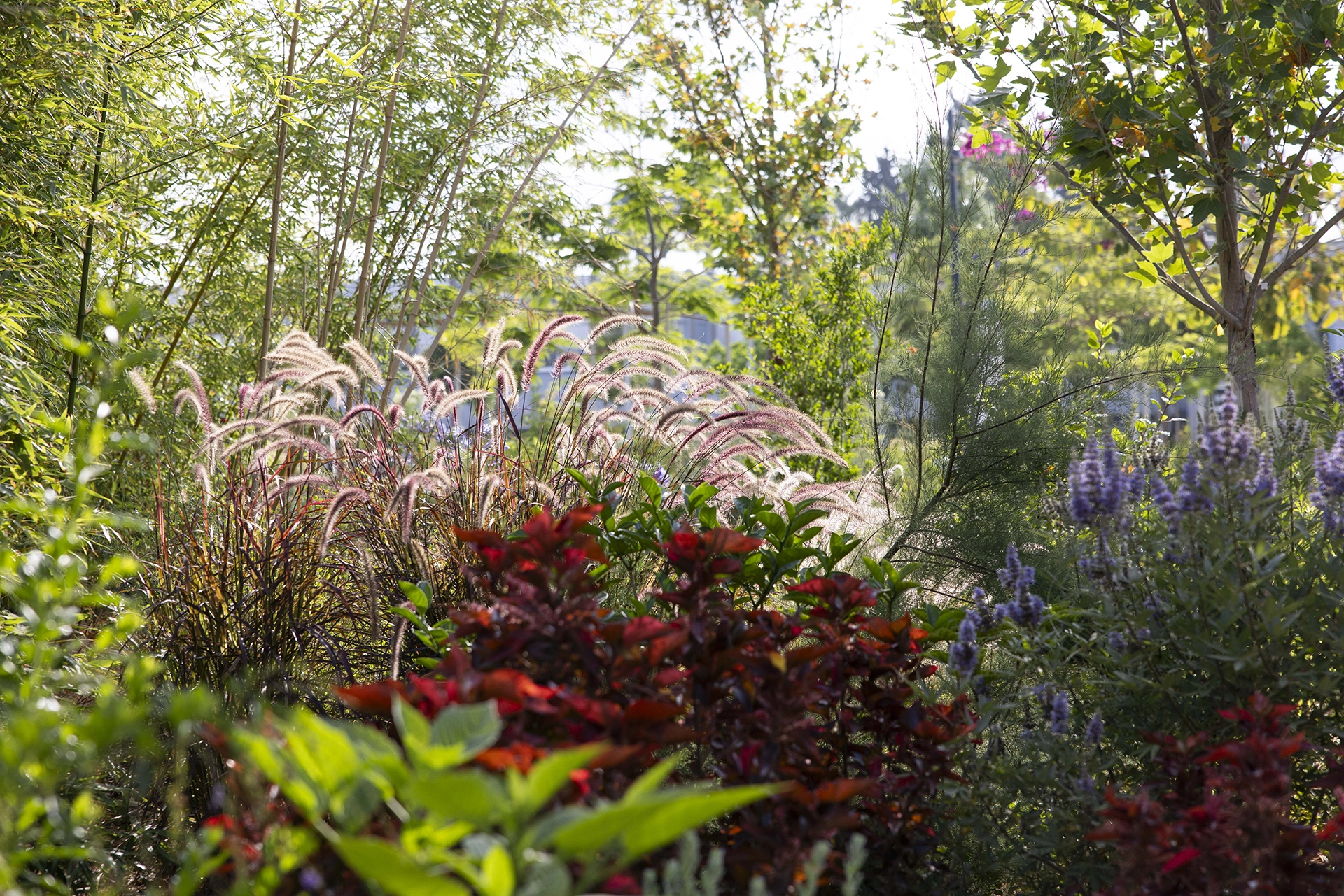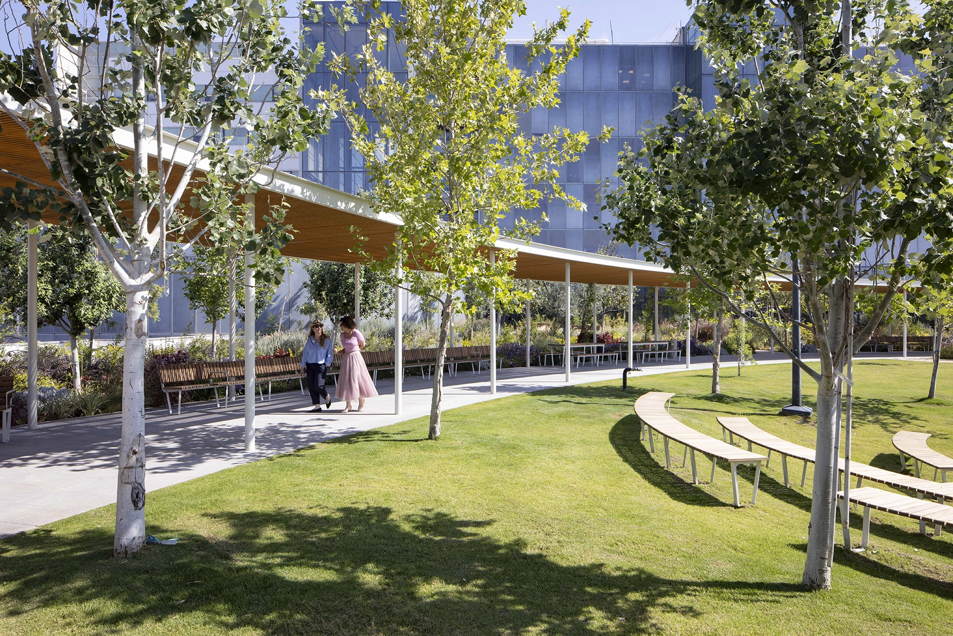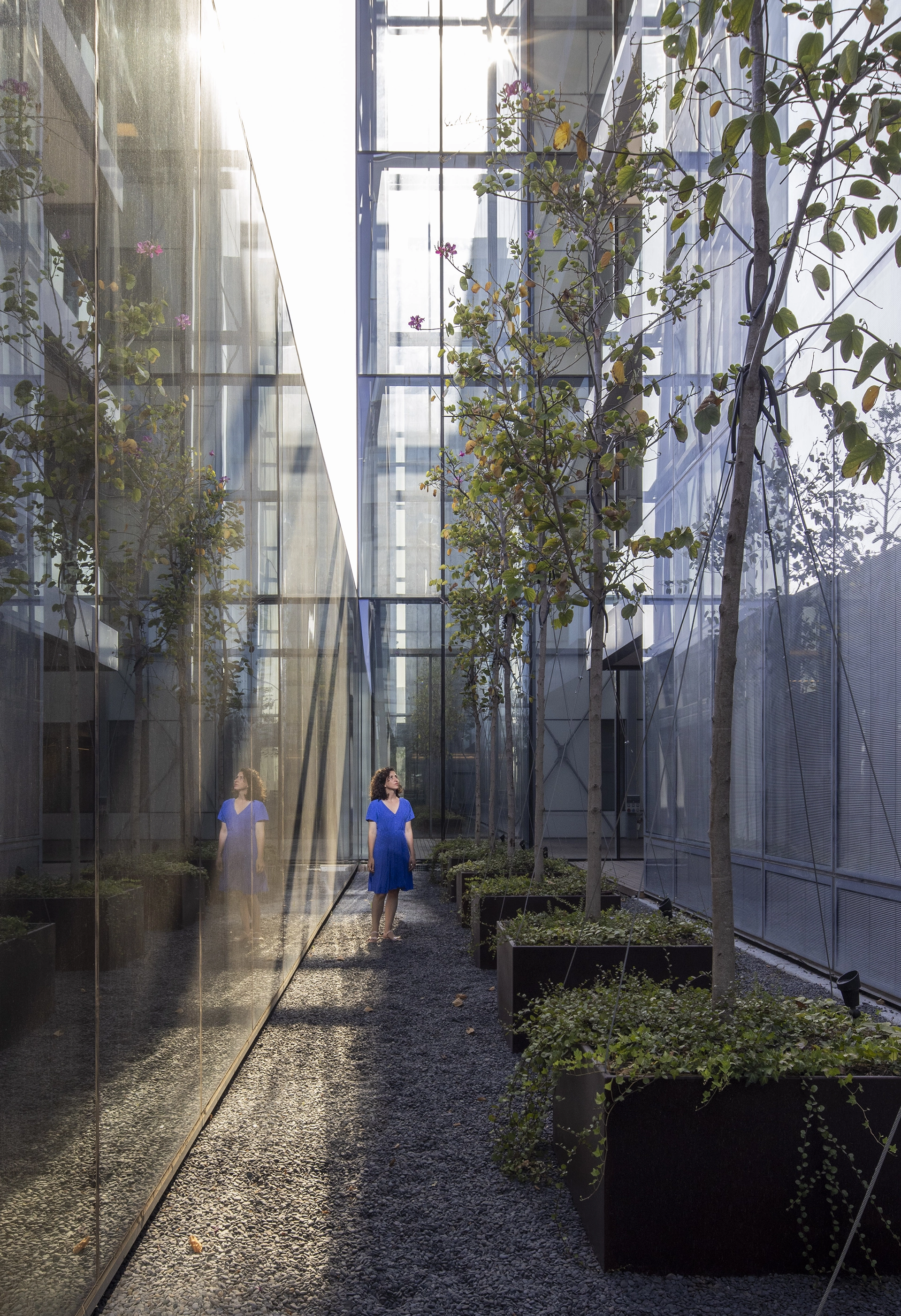 A network of pathways crossing the campus connects the new and existing buildings and allows for increasing intimacy as one moves farther away from the buildings. Hundreds of trees were planted, and diverse vegetation was introduced to create a variety of spatial experiences.