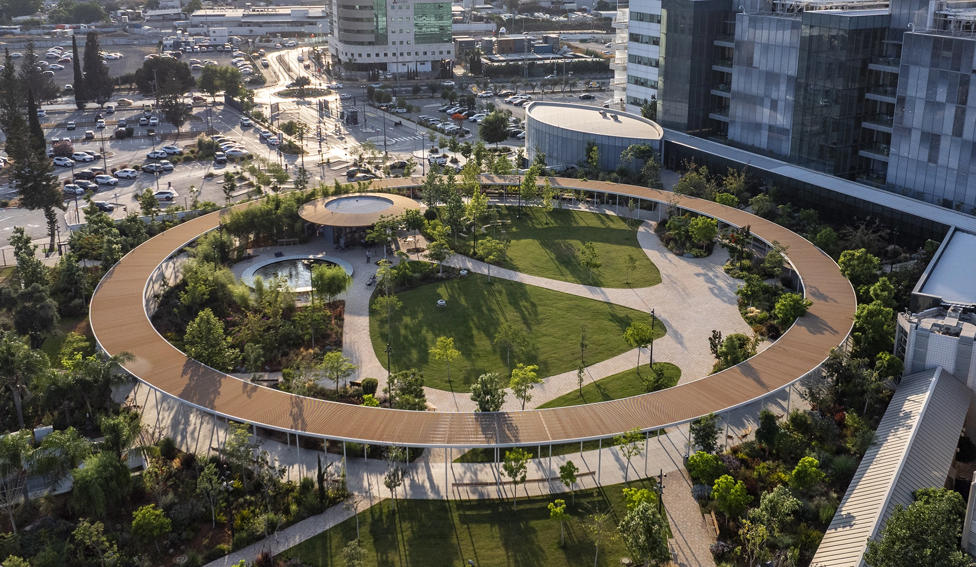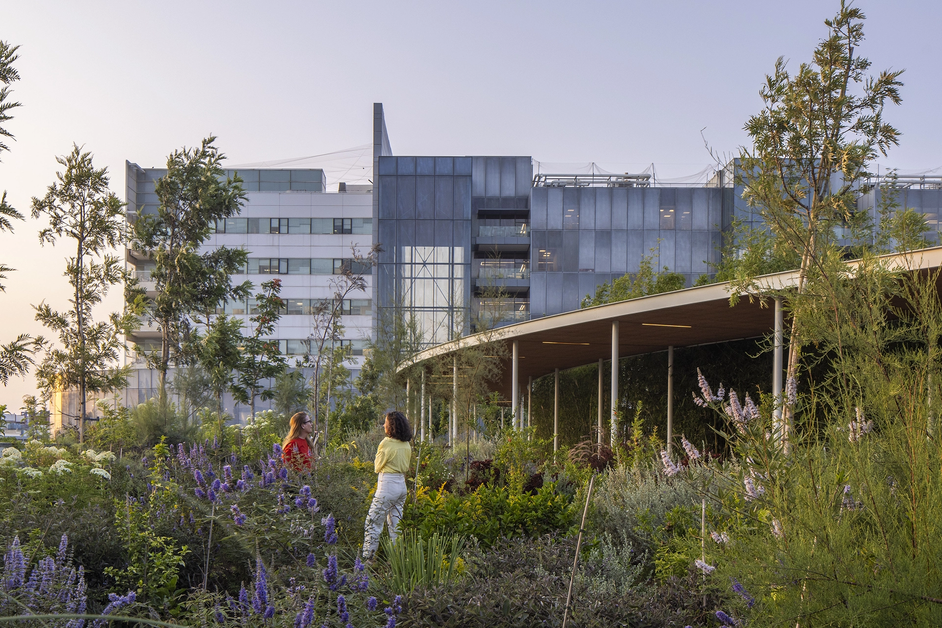 The original office buildings of the communications campus were characterized by an architectural language based on the hexagonal form. The new office buildings frame the campus from the north with an orthogonal architectural language, while at its center a landscaped garden of approximately 9 dunams was created.
