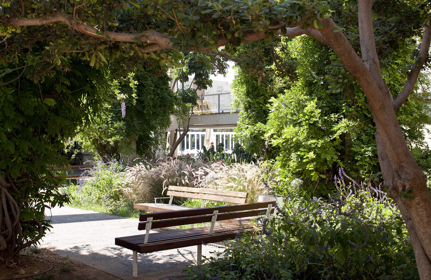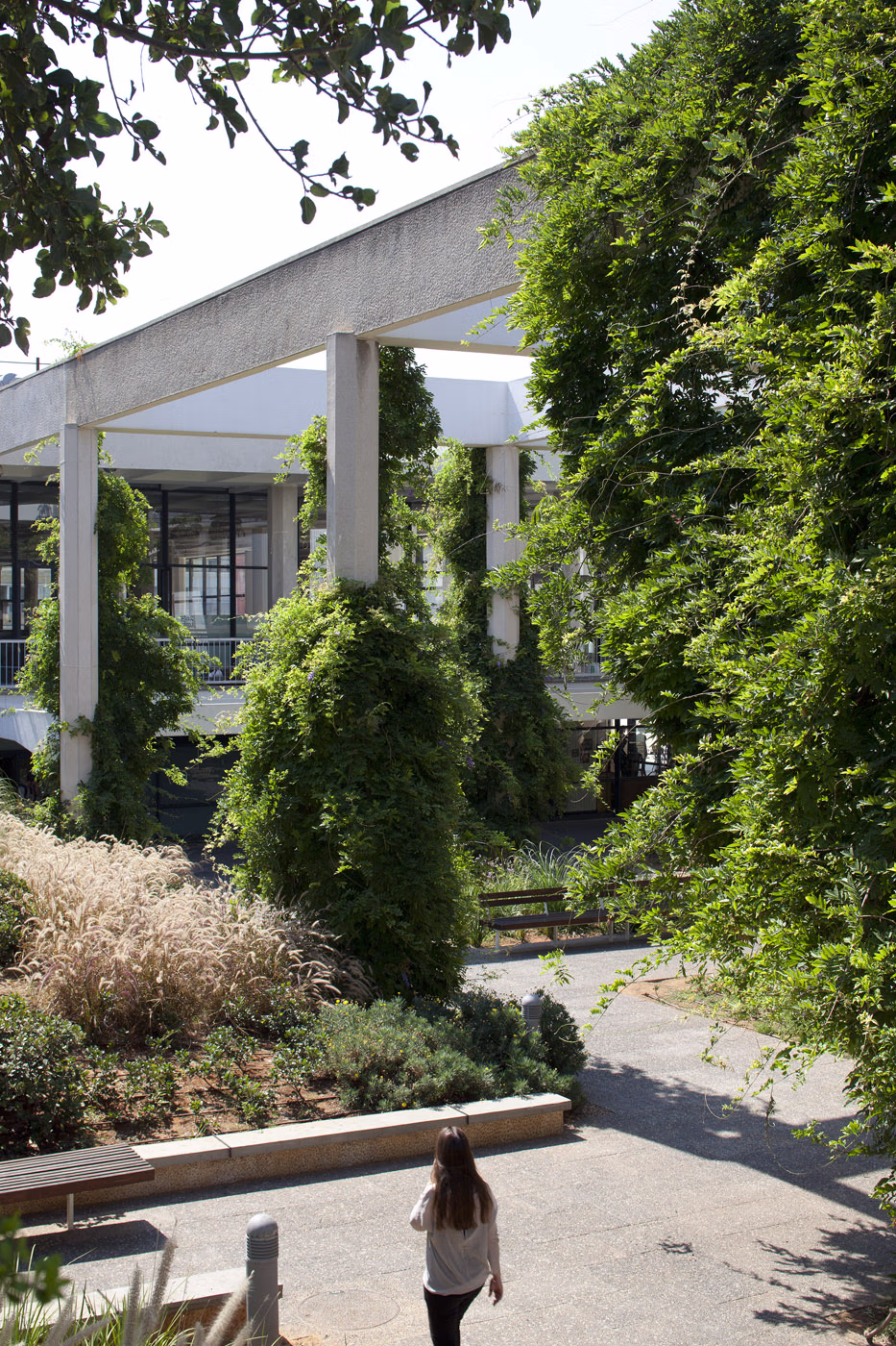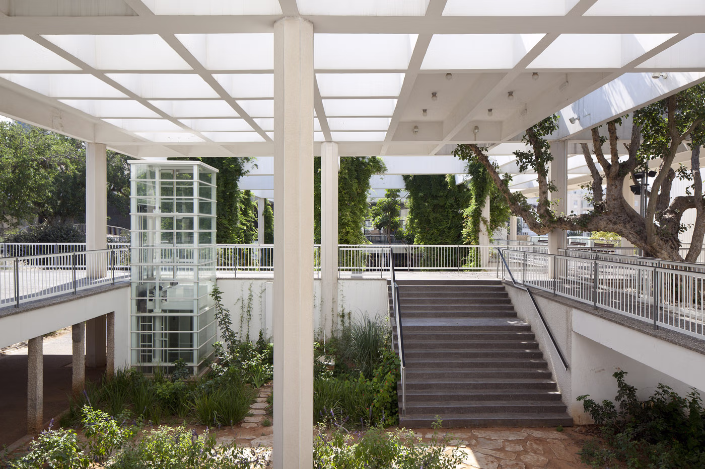 As an extension of Habima Square and the Cultural Hall, Jacob Garden was designed in the 1960s through a collaboration between the architectural firm Rechter, Zarhi, Perry and Tel Aviv’s landscape architect Avraham Karavan. The garden was conceived as an urban continuation of the Cultural Hall and the Helena Rubinstein Pavilion for Contemporary Art. Around three ancient sycamore trees, a system of stairs and ramps was designed to enable a natural transition between different levels, connecting the Cultural Hall lobby, the entrance to the Helena Rubinstein Pavilion, and Culture Square.