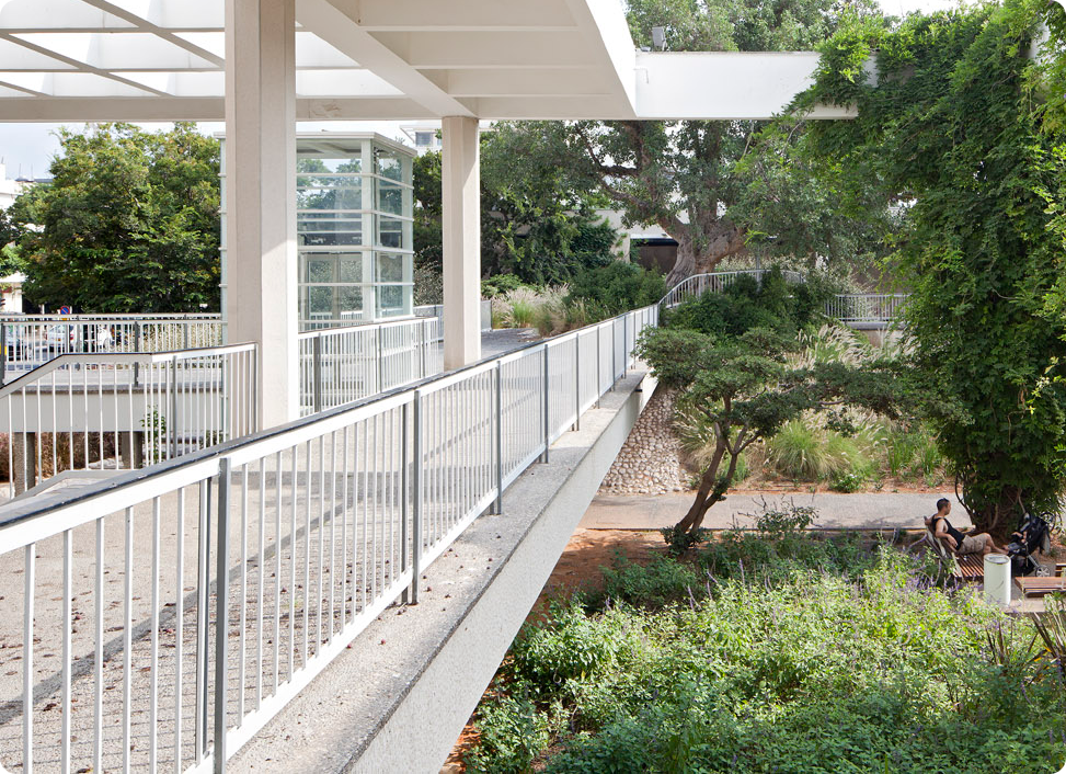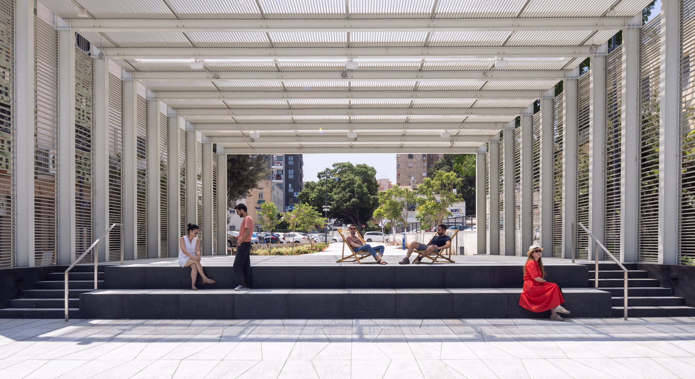 North of Beit HaEzrach, a wooden deck was designed for the longstanding tradition of weekly ballroom dancing events held every Tuesday. This area is framed by custom-built benches and shaded by an old flamboyant tree (Delonix regia), beneath which picnic and chess tables were placed. The design preserves and enhances the square's use by the senior population that frequents Beit HaEzrach, while also allowing for new forms of public use.