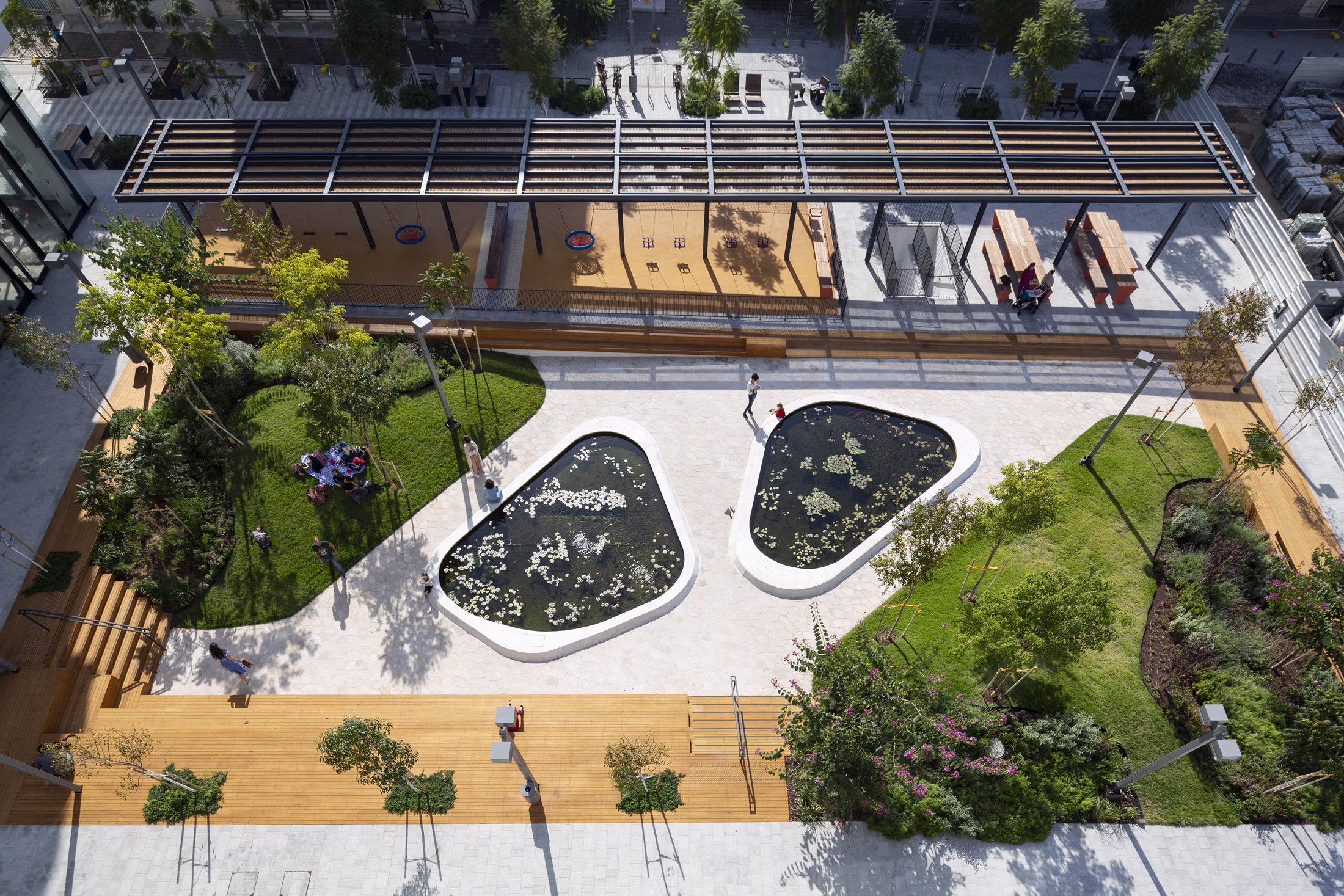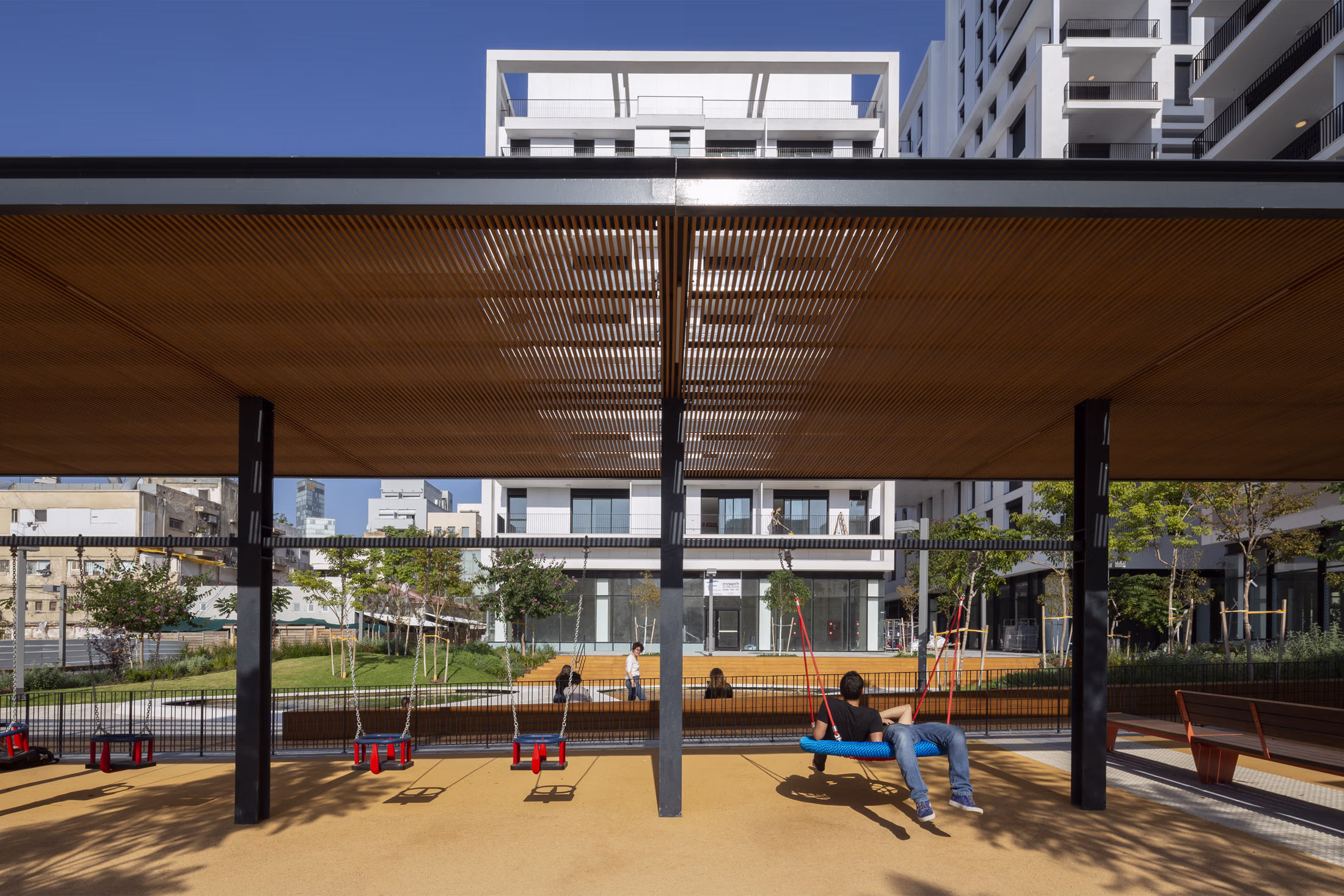 South of the central box is the linear “box,” defined by a steel-and-wood pergola, community picnic tables, playground swings, and steps leading to the underground parking.
