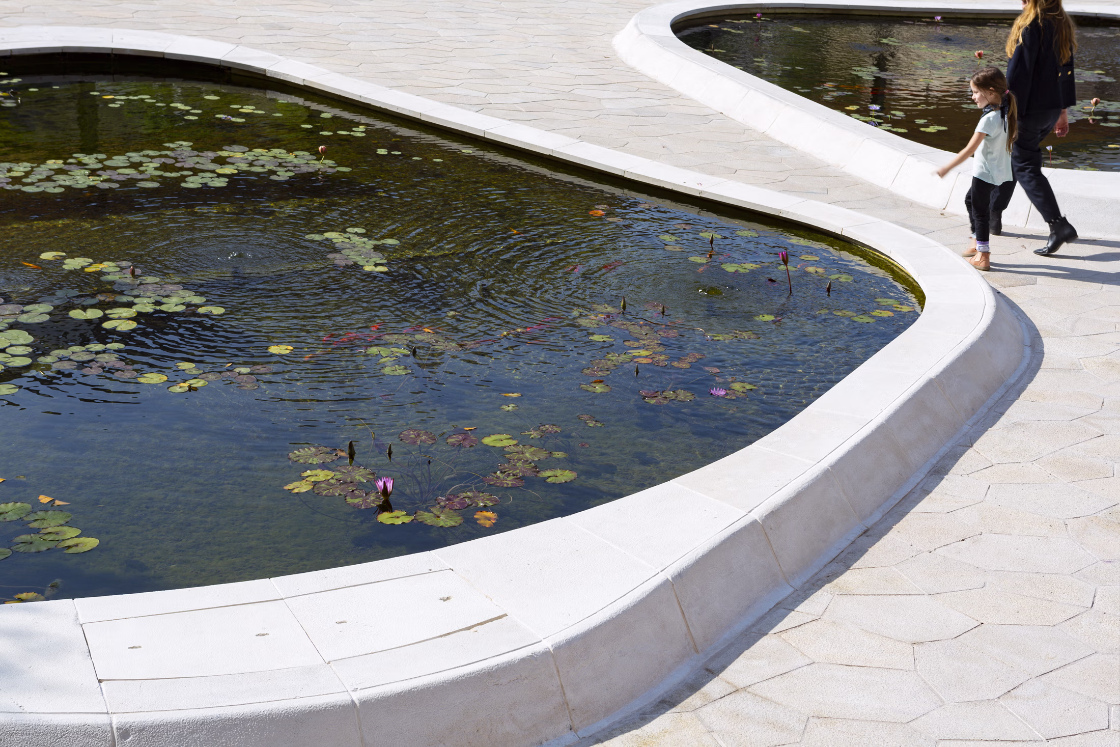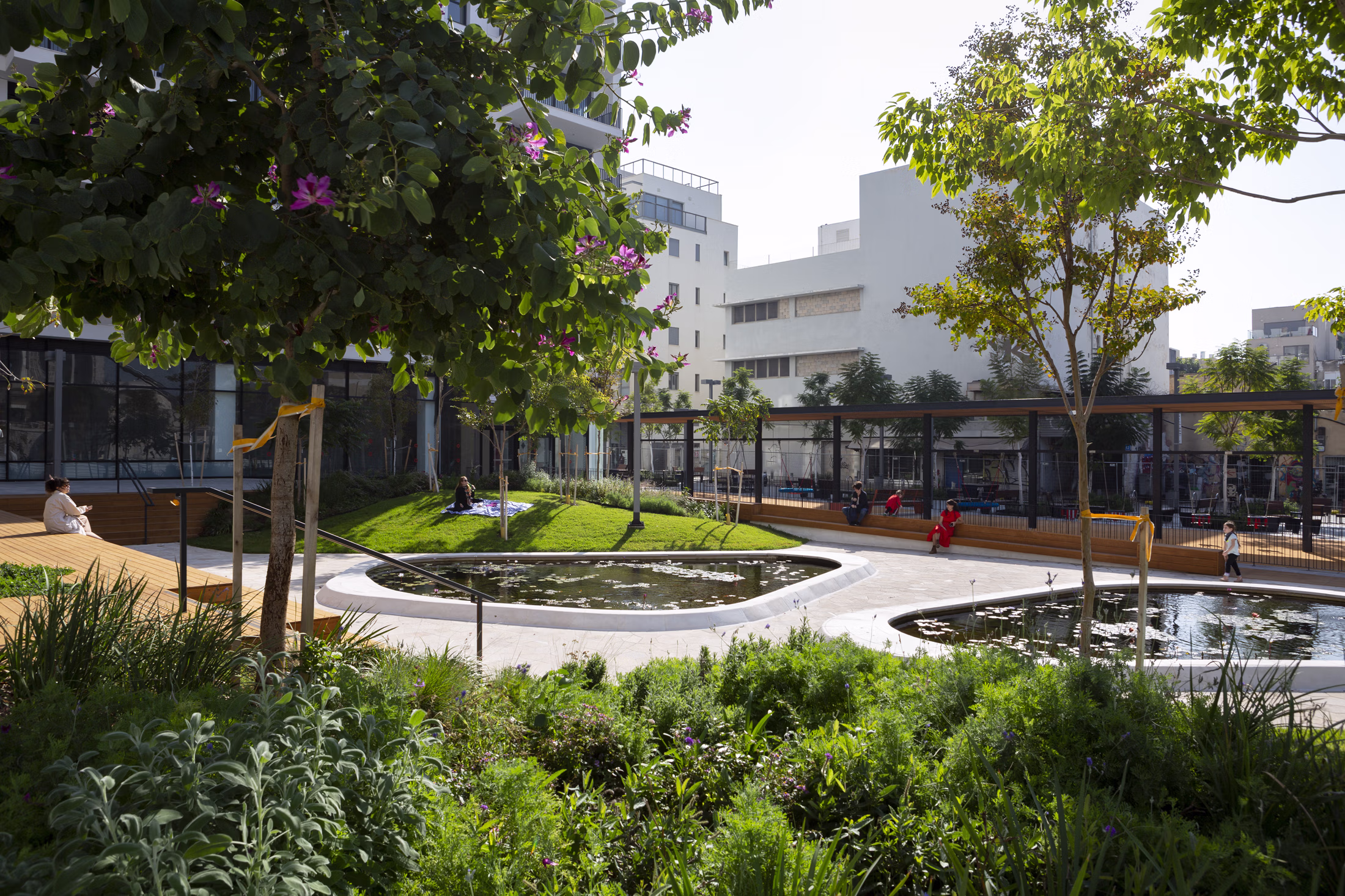 The project is located above a public parking structure, maintaining continuous planting beds at a depth of 1.5 meters, and providing substantial growth volumes for each tree. Over 70 mature trees of nine species were planted to create a shaded, lush environment within a dense urban area. Building systems, pipelines, and ramps serving the buildings and parking are integrated into the structures, remaining invisible in the public realm. The entire project is designed as an open and accessible space, without fences or physical boundaries.