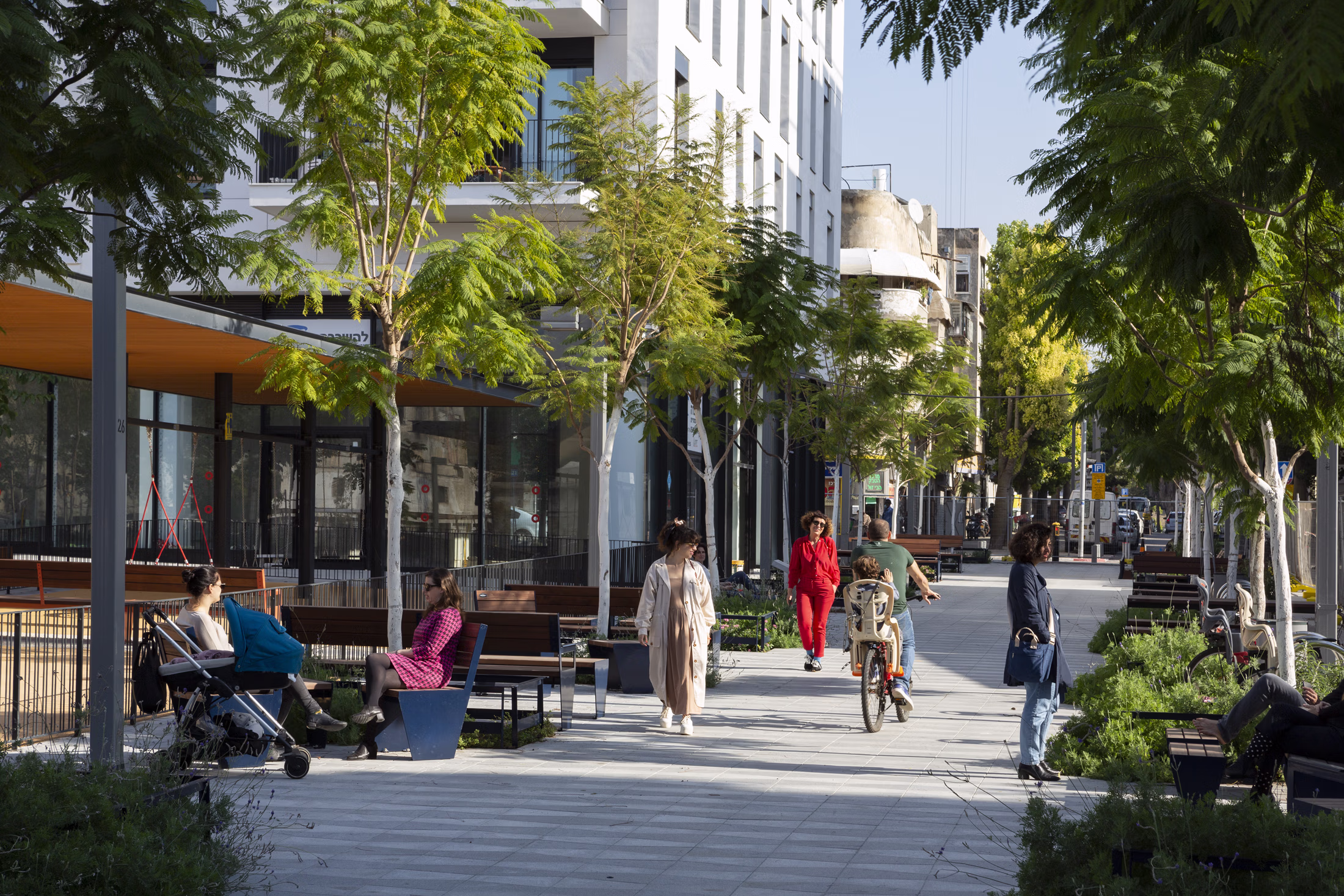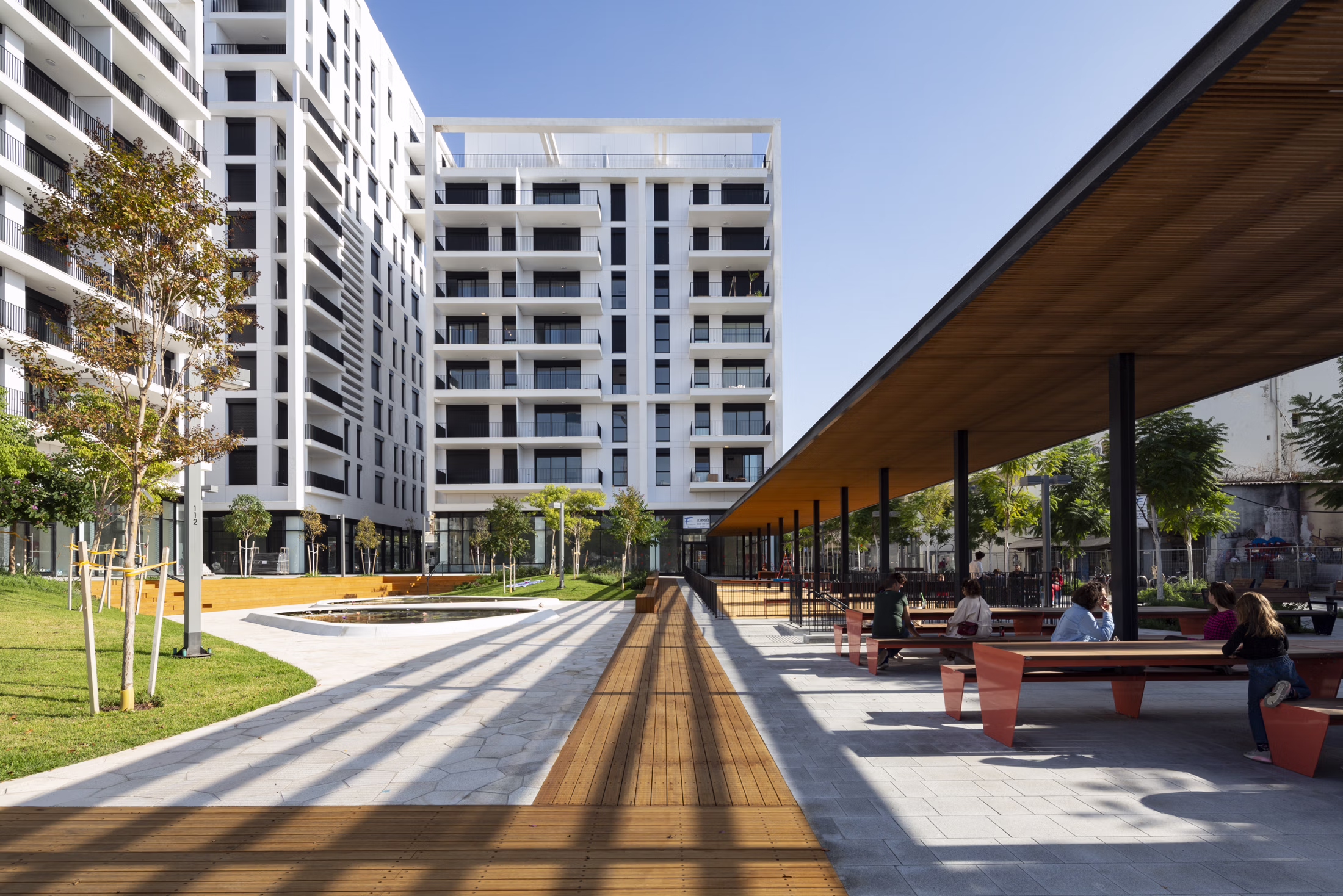 Aliyah Market Complex is located between Aliyah and Chelanov Streets and incorporates the old wholesale market building on Aliyah Street, which has been transformed into a modern country-style facility including a public swimming pool for city residents. The project includes three residential buildings with ground-floor retail, designed by Yashar Architects. The residential buildings and the country facility frame an open public space, accompanied by a double row of trees and a pedestrian street along Wolfson Street. The new central public space serves as an urban, physical, and visual respite, offering a variety of shaded seating areas for passersby and users of the adjacent commercial and residential facilities.